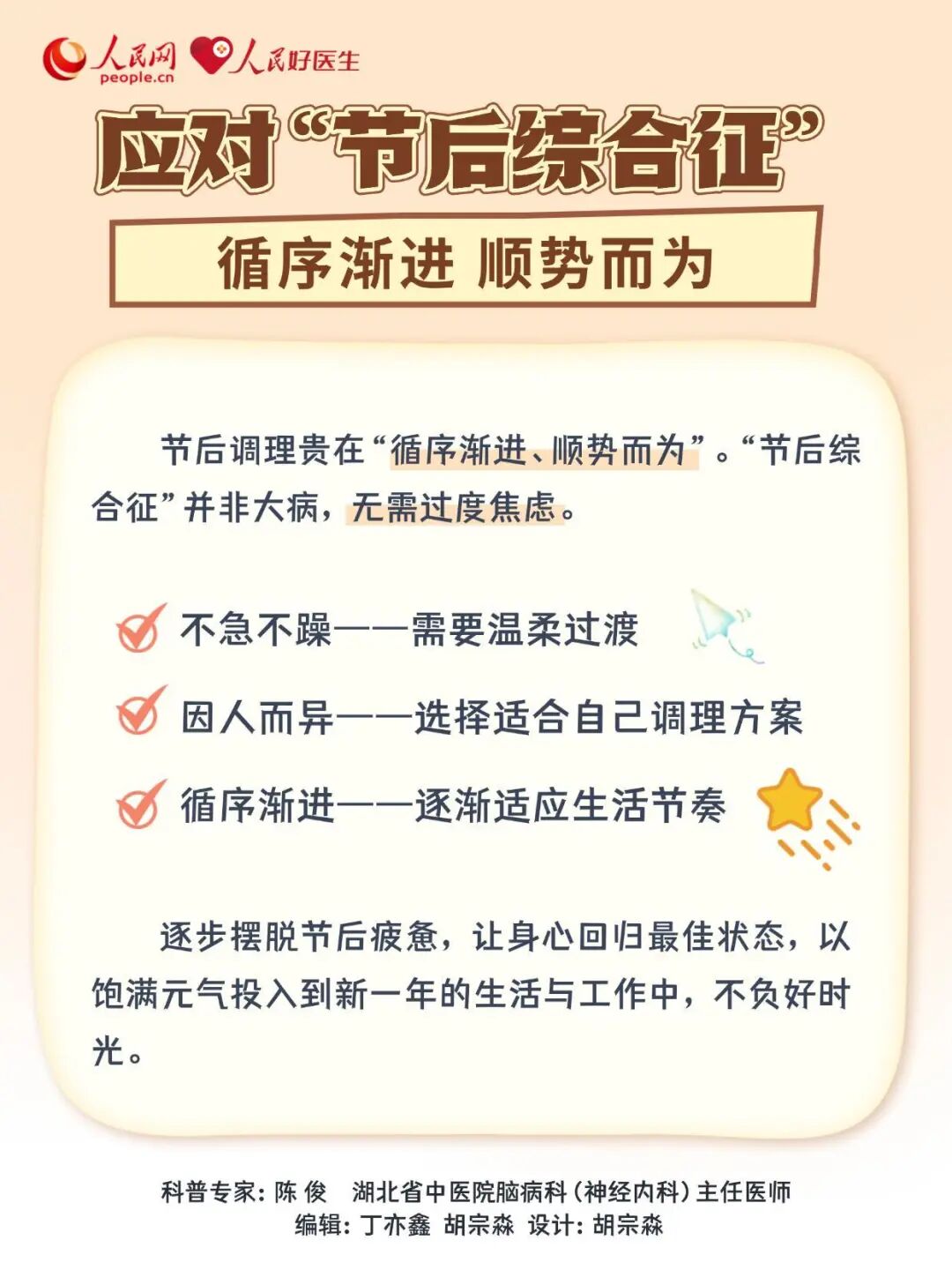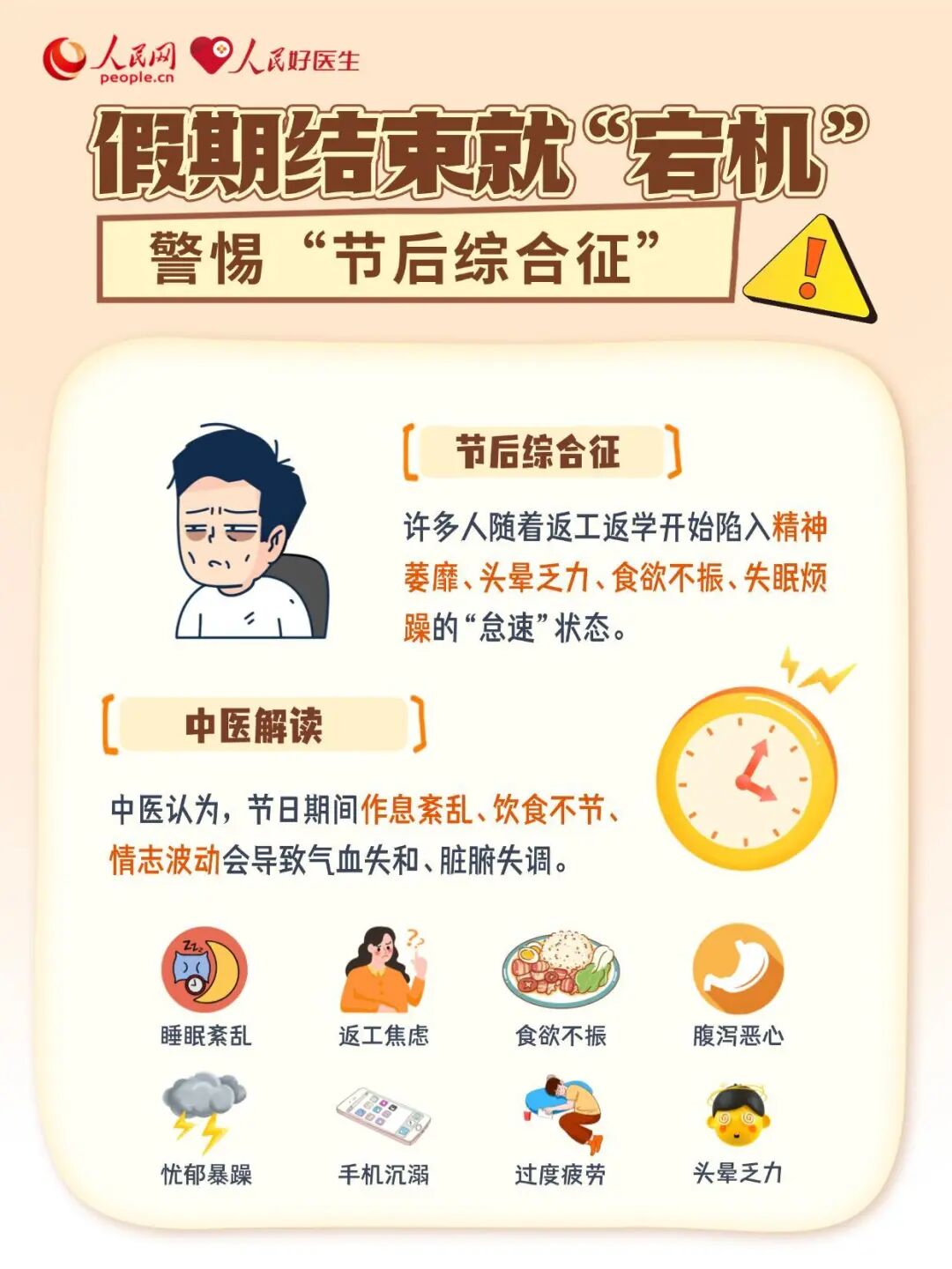 春节假期结束,从休闲放松的状态切换至有序的工作节奏,不少人会遭遇“节后综合征”。如何科学调整身心状态,平稳实现“收心”过渡?不妨试试节后调养“三步法”,助您元气满满开启新一年。
