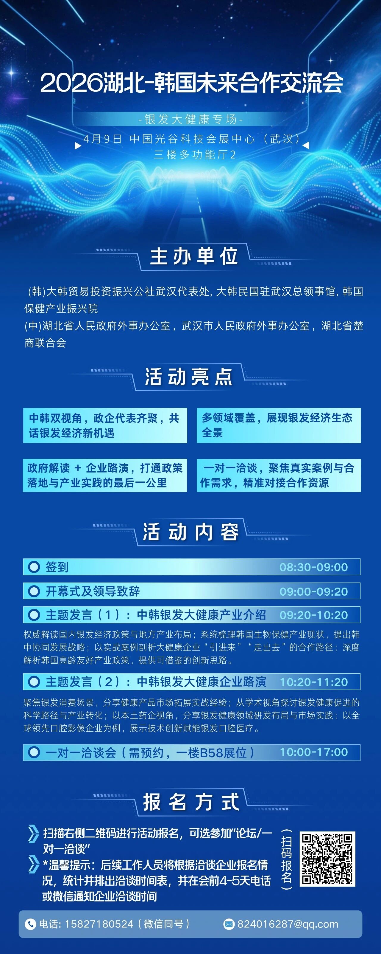 为了庆祝武汉韩国贸易馆开馆30周年,增进两地间大健康产业的交流与合作,计划于2026年(第八届)世界大健康博览会期间举办2026第十二届韩国-湖北未来合作交流会(银发大健康专场),本次交流会将以论坛和一对一洽谈形式展开。
